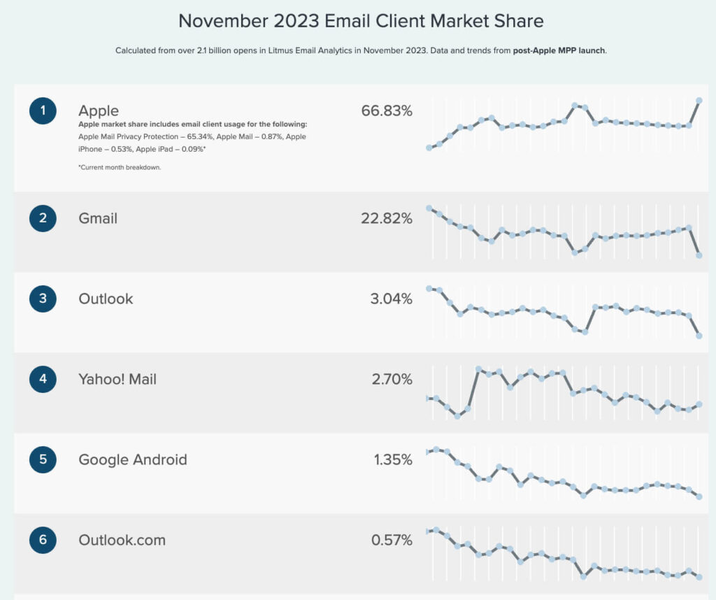 From November 2023 we can see that different domains have different performance, all have great numbers. Every day billions of user opens their email or even every minute. This users can be great targeted for email marketing.